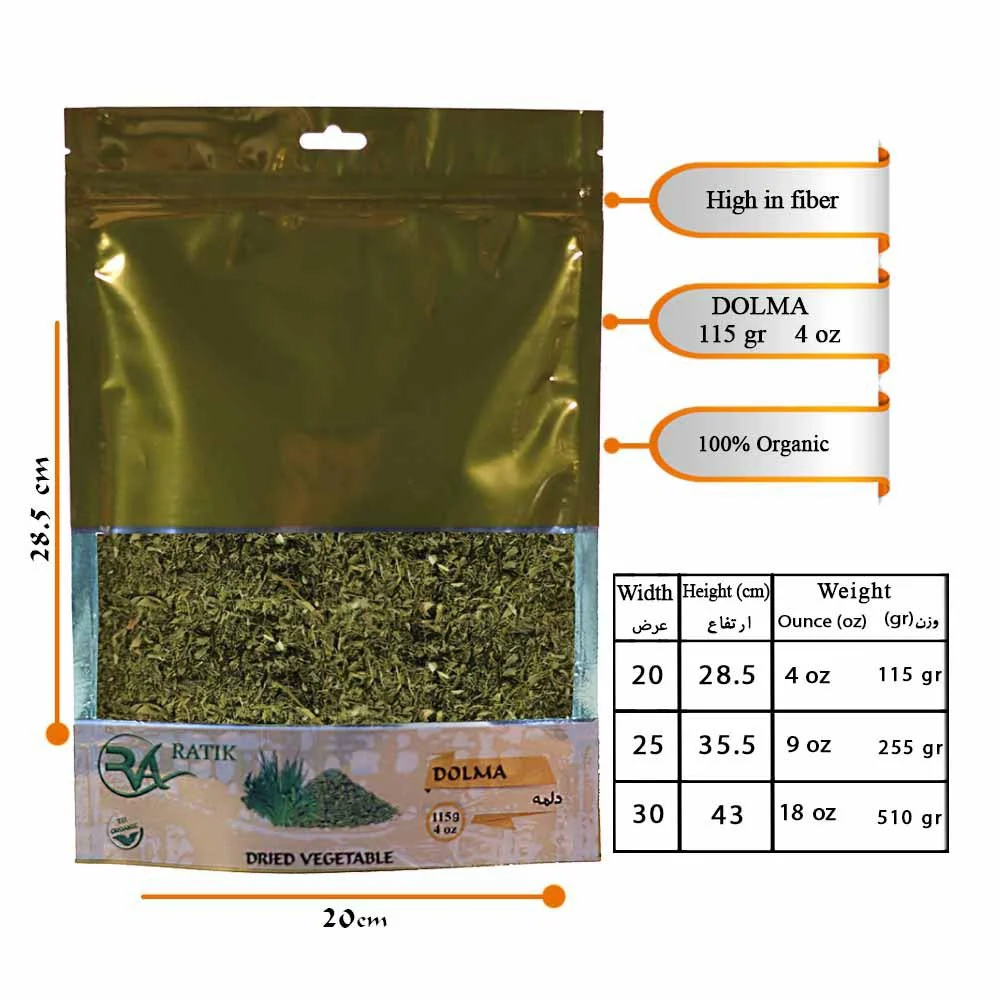 سبزی خشک دلمه از ترکیبی متعادل از سبزیجات معطر تشکیل شده که عطر و طعم سنتی دلمههای خانگی را به ارمغان میآورد. این سبزی سرشار از فیبر، ویتامینها و آنتیاکسیدانها است که به تقویت سیستم گوارش، افزایش ایمنی بدن و بهبود سلامت قلب کمک میکند. با ماندگاری بالا و کاربرد آسان، انتخابی ایدهآل برای تهیه دلمه برگ مو، کلم، بادمجان و فلفل دلمهای است.