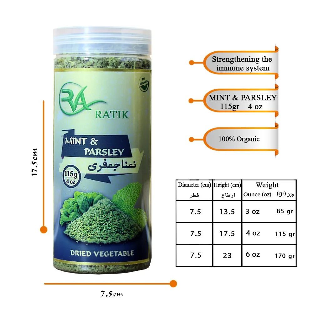 سبزی خشک نعناع جعفری ترکیبی از دو گیاه مفید است که علاوه بر طعم و عطر بینظیر، خواص بسیاری نیز دارد. نعناع با خواص ضد التهابی و آرامبخش خود، به تسکین مشکلات گوارشی، کاهش دردهای معده و تسهیل هضم کمک میکند. از سوی دیگر، جعفری غنی از ویتامین C، آهن و آنتیاکسیدانهاست که به تقویت سیستم ایمنی، سلامت پوست و کاهش تورم بدن کمک میکند. این ترکیب طبیعی علاوه بر افزودن طعم به غذا، به بهبود سلامت کلی بدن و تقویت انرژی شما نیز کمک میکند.