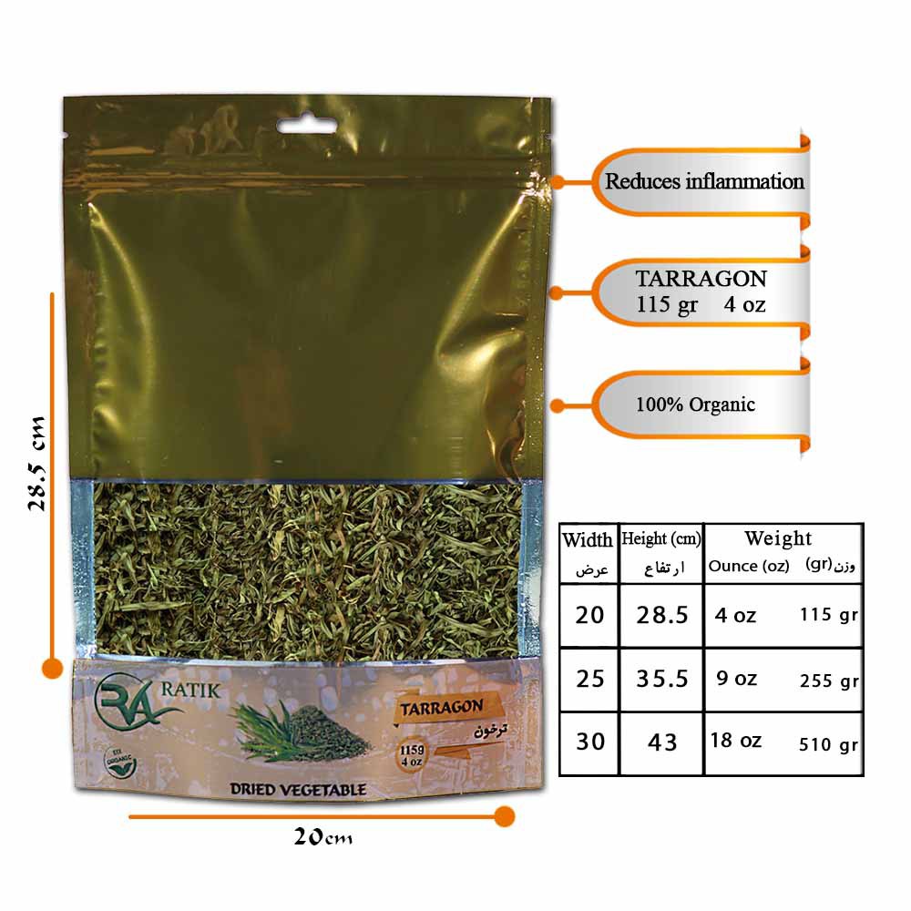 با ترخون خشک ارگانیک، میتوانید طعمی فوقالعاده به انواع سوپها، خورشها، سالادها، مرغ و ماهی ببخشید. این محصول همچنین برای تهیه ترشی و انواع چاشنیها انتخابی بینظیر است.